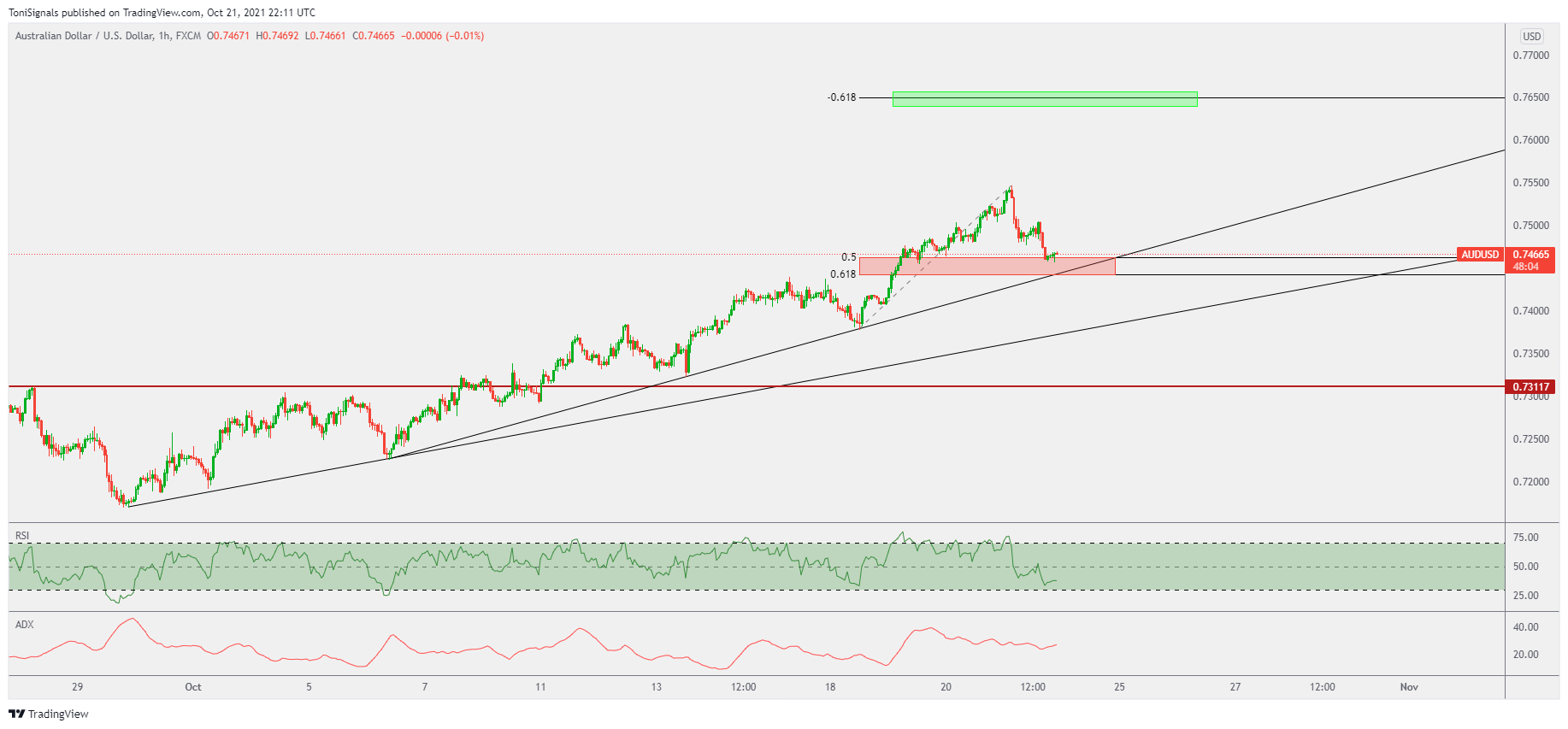 Price is currently at support on the 1H chart, on the fibonacci golden pocket and the inner trendline. If these supports hold we look for continued upside into the 0.7650 price at the 61.8% fibo extension. If the support breaks look for price to move into the outer trendline.