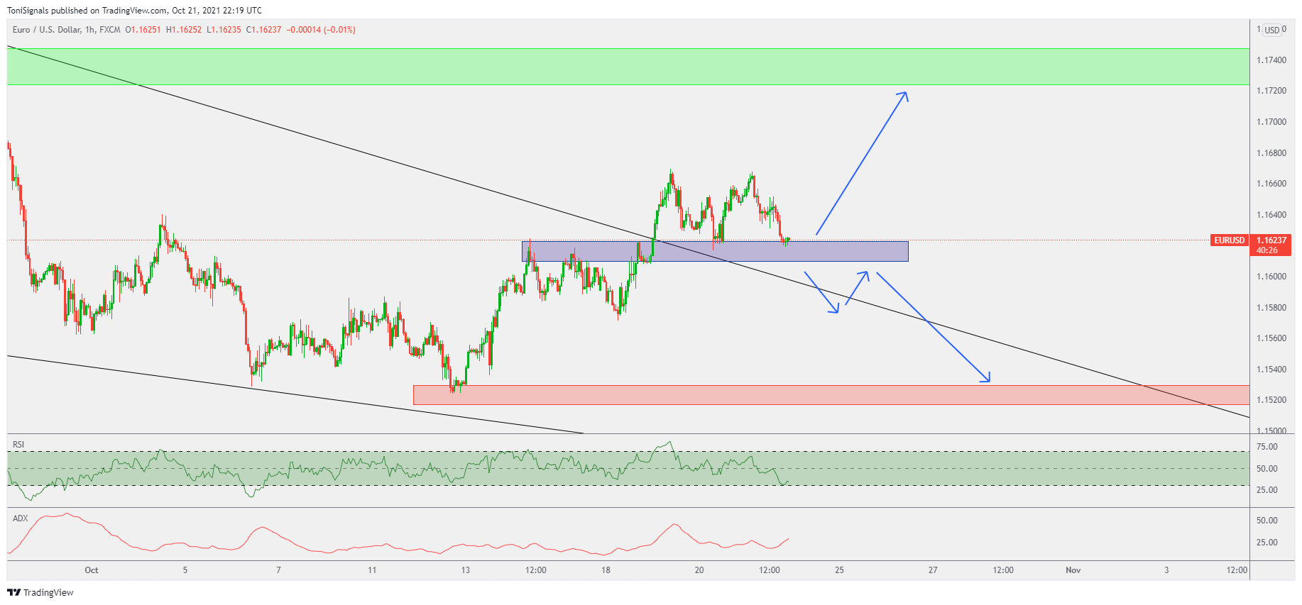 Price has formed a tweezer bottom candlestick pattern at support, and has broken the resistance trendline. The RSI has also given a buy signal. We are looking for price to retest the head and shoulders neckline.
