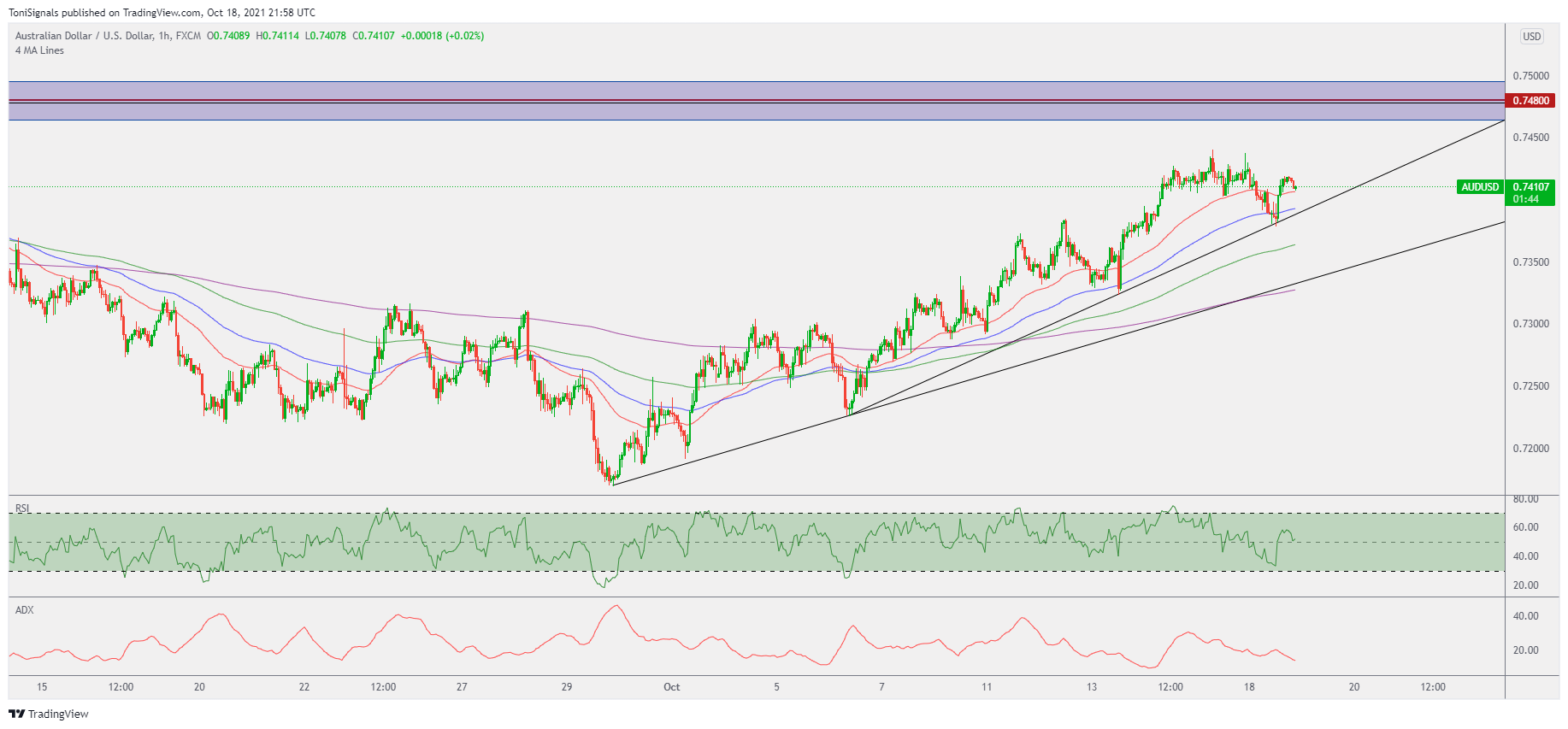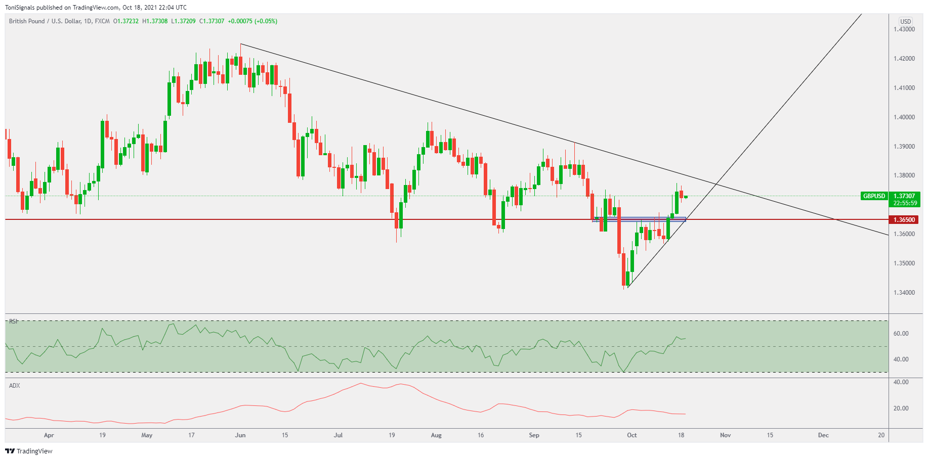 AUDUSD closed with a bearish doji on the daily chart, suggesting that price may be correcting. The RSI is still bullish, and the ADX has started slightly increasing, marking a new bull trend is likely.