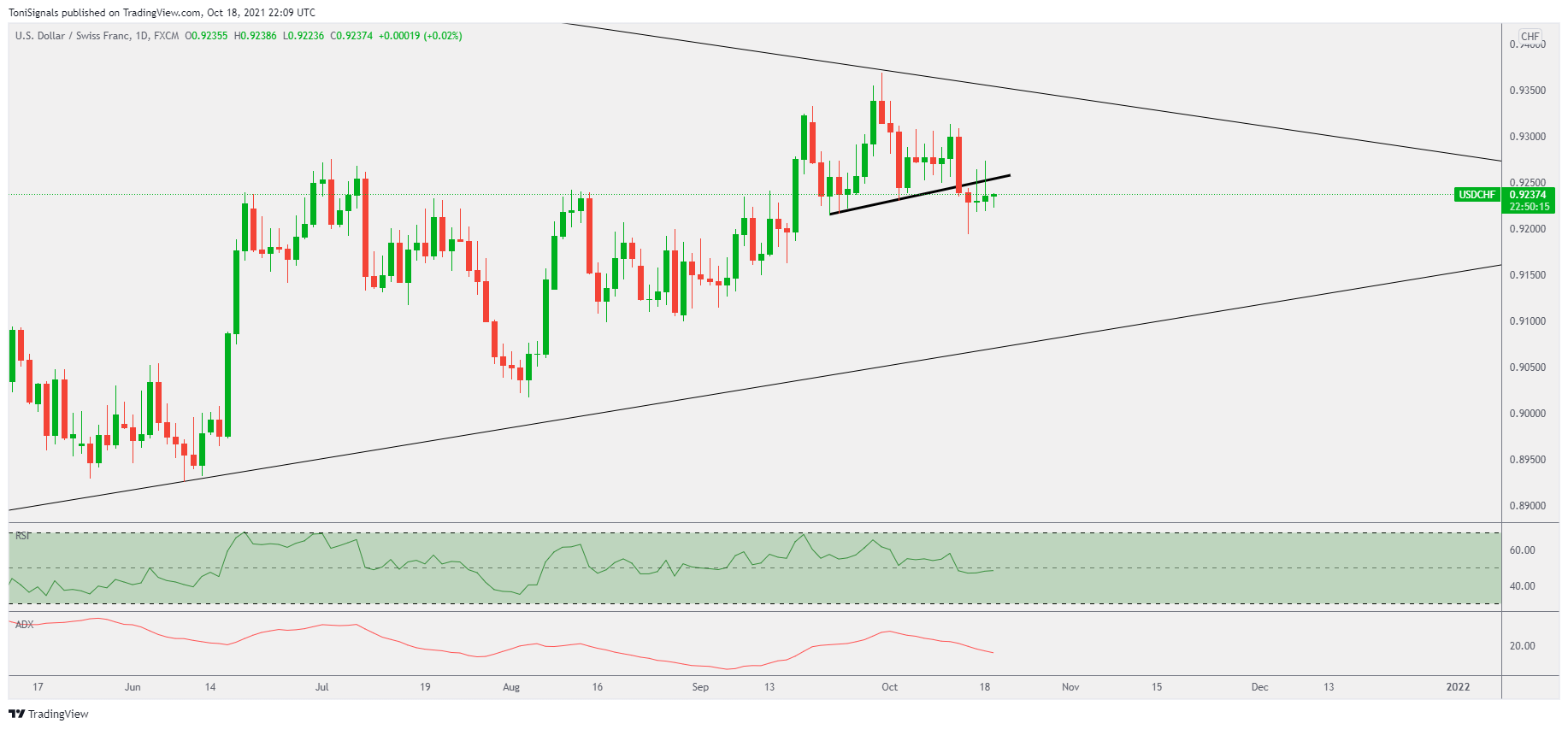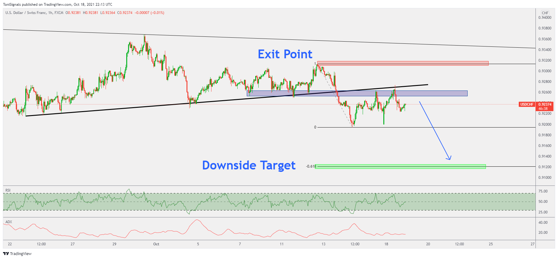 Price is holding structural resistance around 0.9260, and the RSI is holding below the 50% level. All technicals are pointing to continued downside on this pair.
