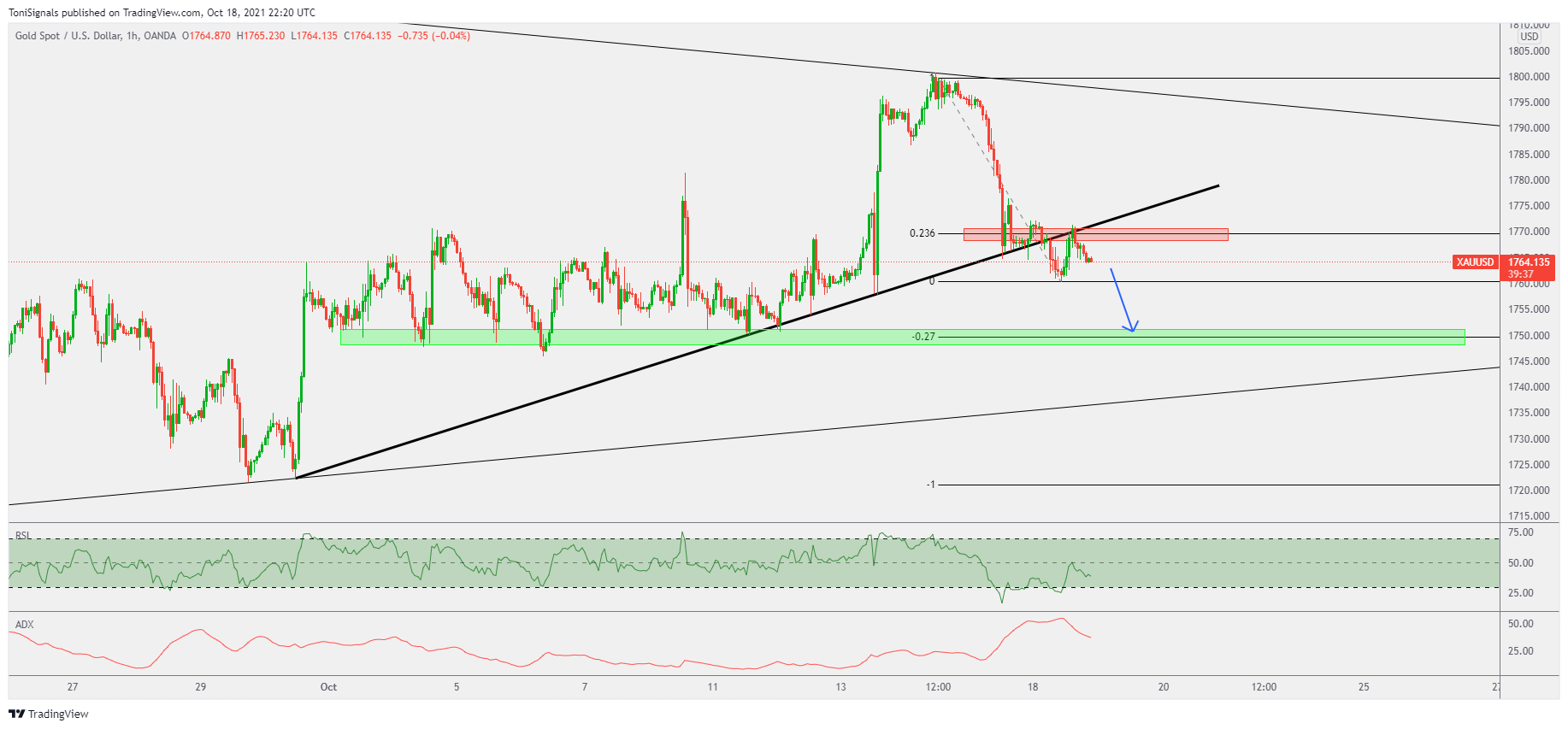 The RSI has now dropped below the 50% level, and price looks likely to test the trendline support around 1740.