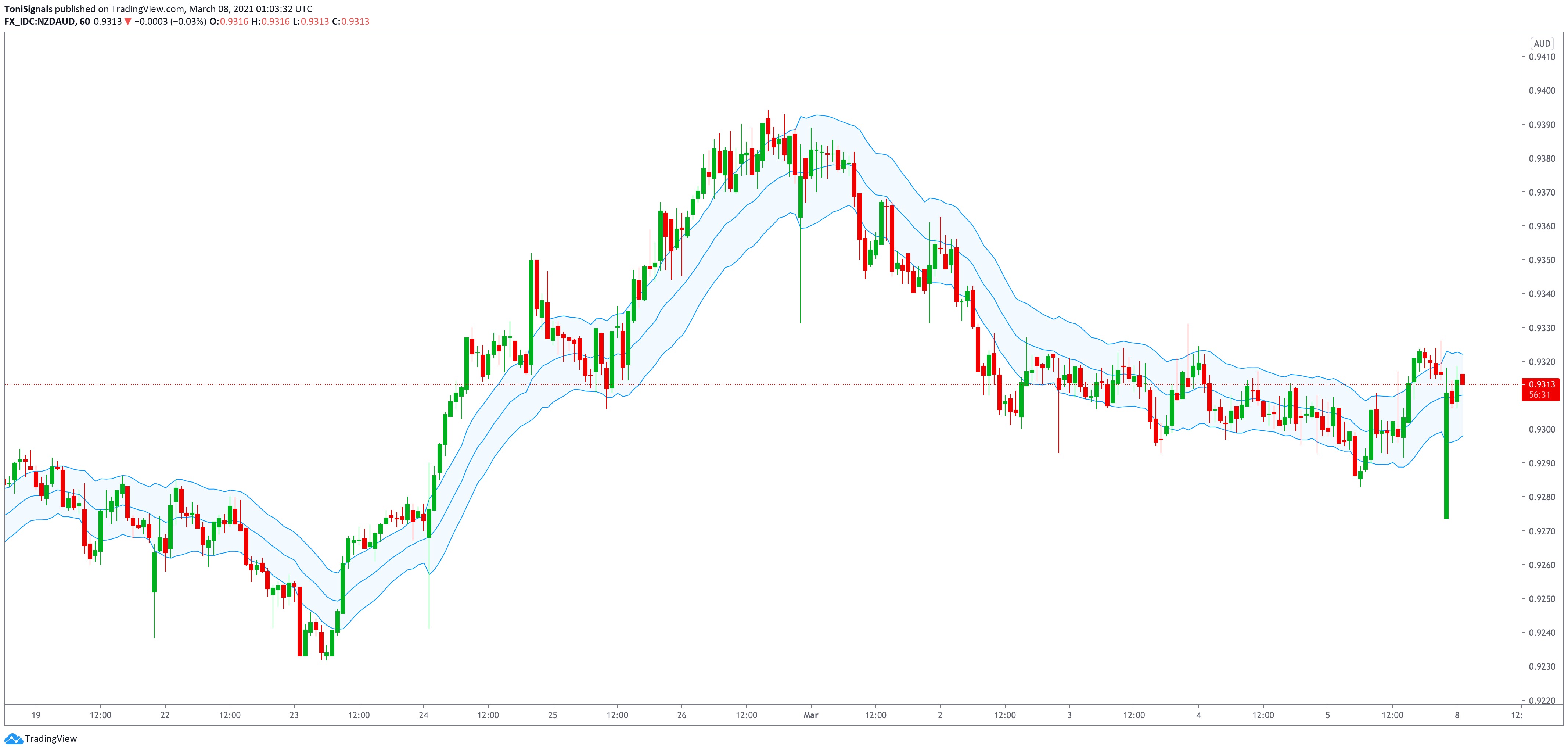 Most price action will be within the keltner channel, therefore moves outside the channel can signal trend changes and accelerations of trends. The direction of the channel can also be used to identify the trend direction of a pair, whether it is moving up, down or sideways.