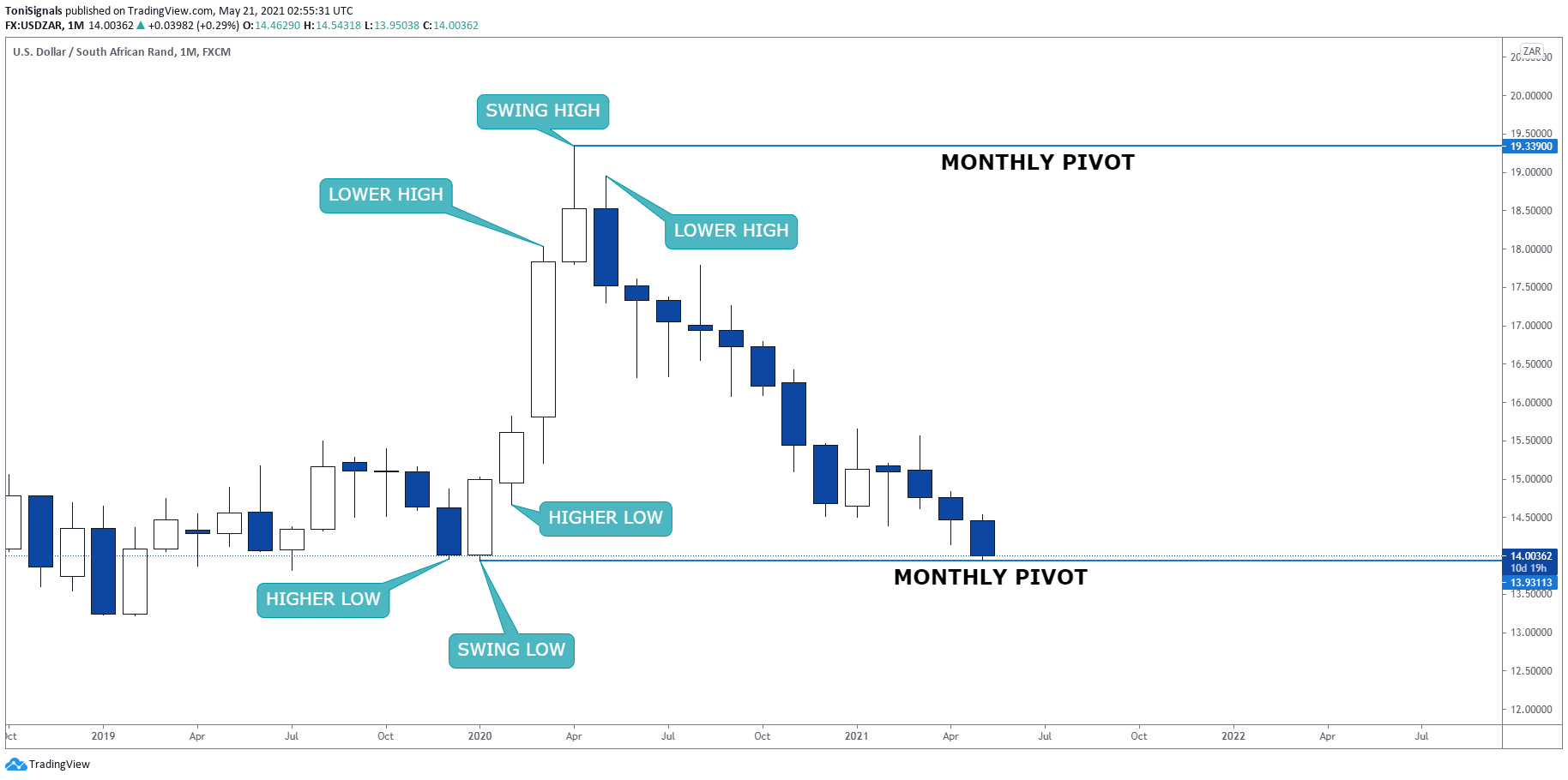 A monthly pivot level is a level that price reached and reversed from. This is either a swing high or a swing low on a monthly chart. For a swing high pivot to form there must be a candle on either side of the swing high candle, both with a lower high. For a swing low point to form there must be a candle with a higher low on either side of the pivot candle. As we’re talking about monthly pivots, these are found on the monthly chart, where each candle represents one month of trading. Below you can see an example of identifying swing points on a monthly chart.