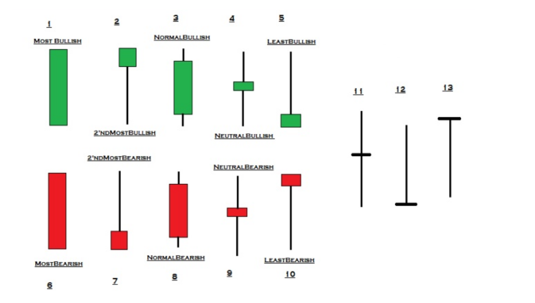 It is also important to be able to recognise different types of candlesticks. The types of candlesticks that will help you with this strategy are below - namely 11, 12 & 13. These are known as indecisive candles, and represent an exhaustion of a movement.