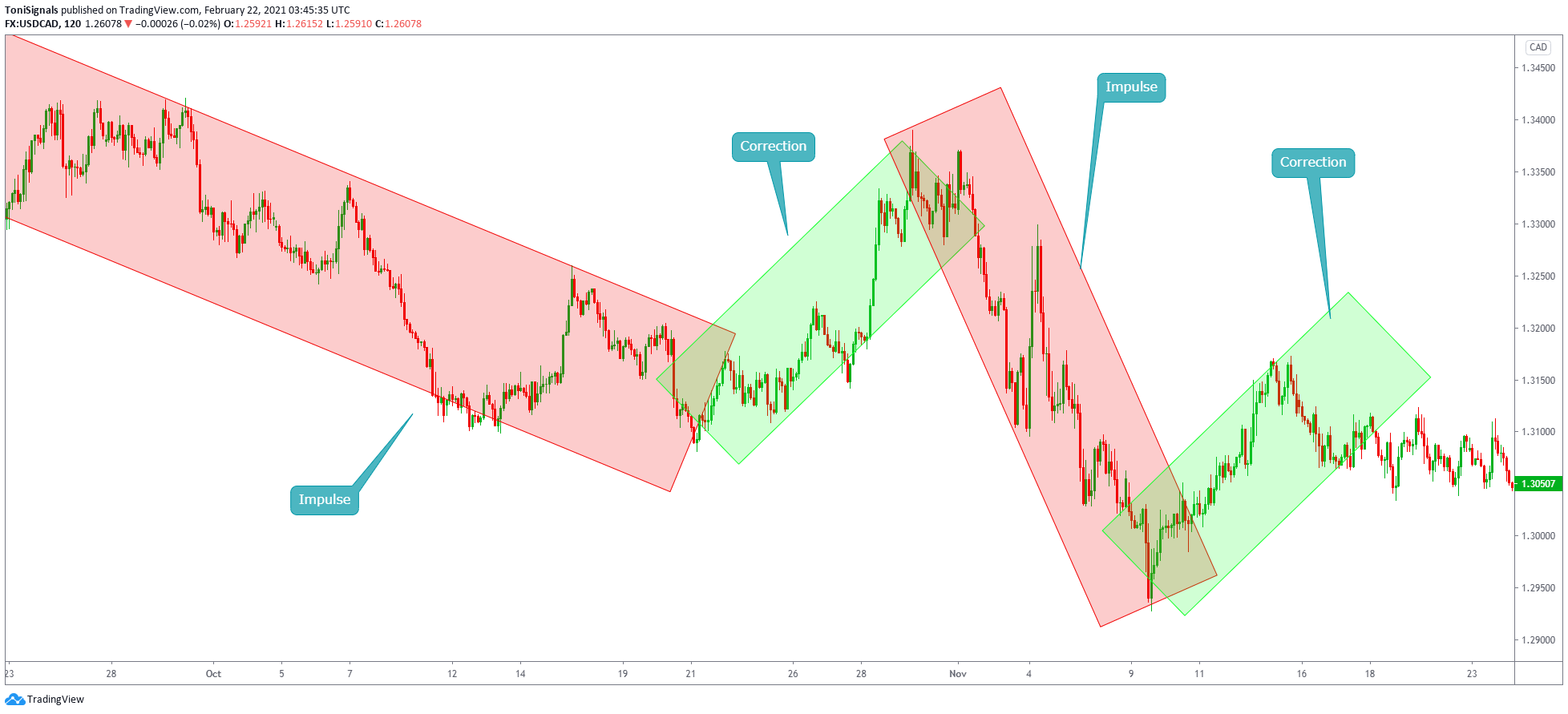 To trade this strategy it is important that a trader understands price action basics. The first step of this is identifying trend direction. Typically this is done by looking for the impulse & correction moves that a forex pair cycles in.