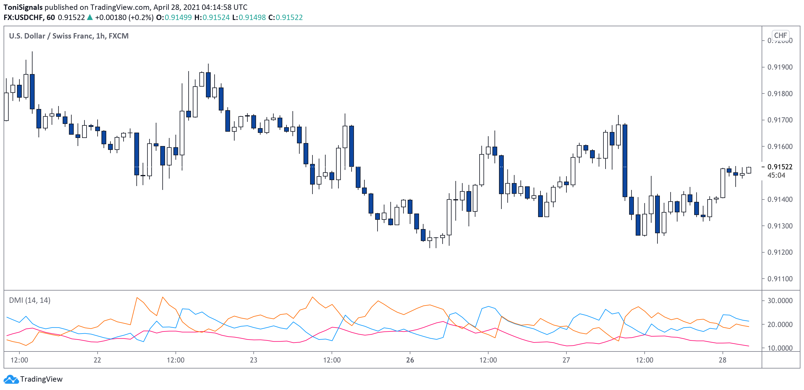 As seen in the image above with the DMI applied to the chart, the +DI is the blue line, -DI is the orange line and the ADX is the pink line.