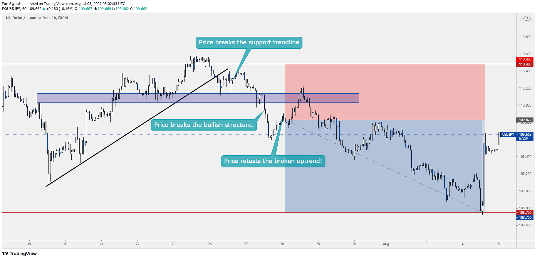 First USDJPY was trending to the downside. We recognised this trend as the moving average ribbon was in a bearish cross, structure was forming lower lows and lower highs, and price was impulsive to the downside and corrective to the upside.