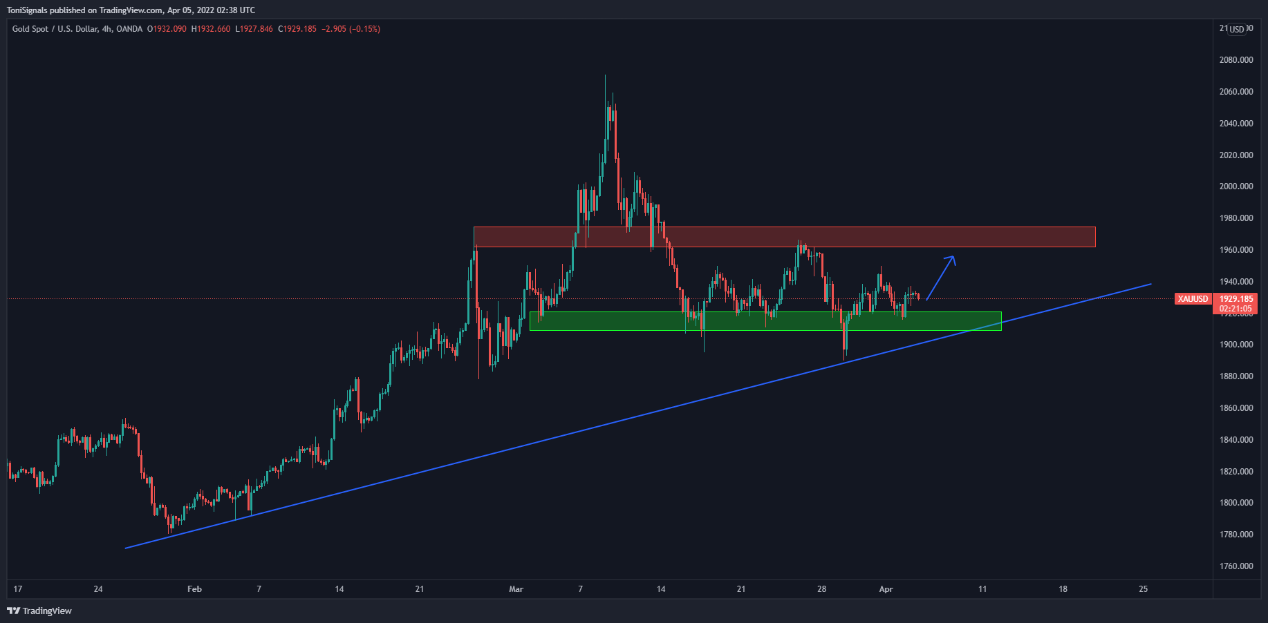 Price has the significant support zone around the key 1900$ mark, and the double top neckline as resistance at the 1965$ mark.